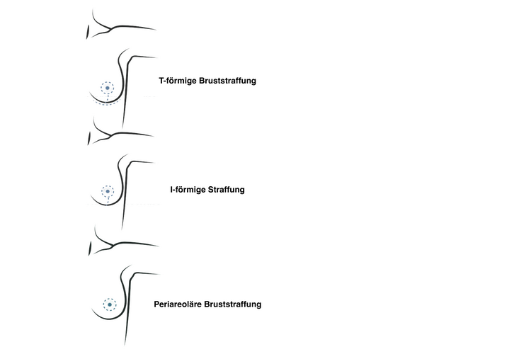 Die Narbenführung hängt vom Ausgangsbefund ab. Meistens kommt ein sogenannter T-Schnitt oder i-Schnitt zum Einsatz, der sich gut in die natürliche Brustform einfügt und mit der Zeit verblasst. Am Anfang ist jede Narbe erstmal gerötet und wird dann später rosa und nach dem Abblassen weißlich.